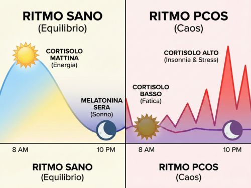 Questo è devastante. Significa che il ritmo del cortisolo è invertito o appiattito. Invece di avere un picco al mattino che scende progressivamente durante il giorno, le donne con PCOS mantengono livelli elevati anche la sera, quando il corpo dovrebbe prepararsi al riposo. Cortisolo alto la sera significa soppressione della melatonina, difficoltà ad addormentarsi, sonno frammentato, stanchezza cronica. E cortisolo basso al mattino significa difficoltà a svegliarsi, nebbia mentale, zero energia.